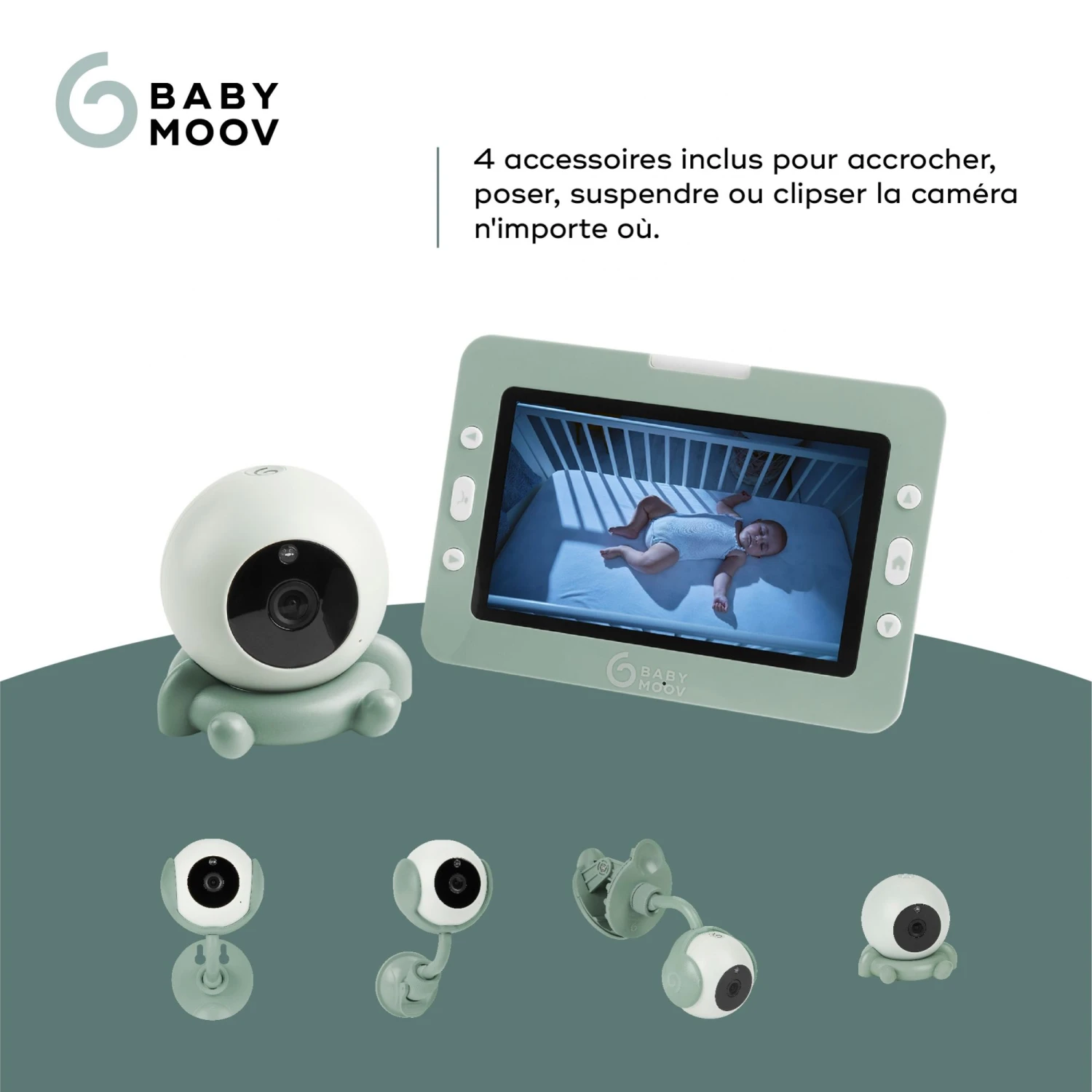 - Grâce aux 4 accessoires fournis vous pouvez accrocher votre babyphone partout: socle, ventouse, pince et fixation murale!