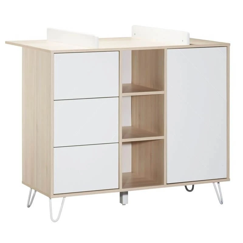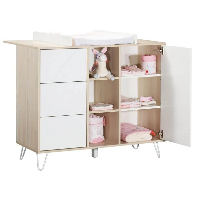 Commode : Cette commode possède des séparations verticales. Du côté porte, il y a 2 tablettes intérieures, les 3 niches comprennent également 2 tablettes . Le dessus a été fabriqué en panneaux de particules revêtus de papier décor Acacia clair. Pour utiliser la commode en toute sécurité, il est conseillé de la fixer au mur à l’aide de sangle (fournie). Votre petit bout pourra ranger toutes ses petites affaires dans cette jolie commode made in France !