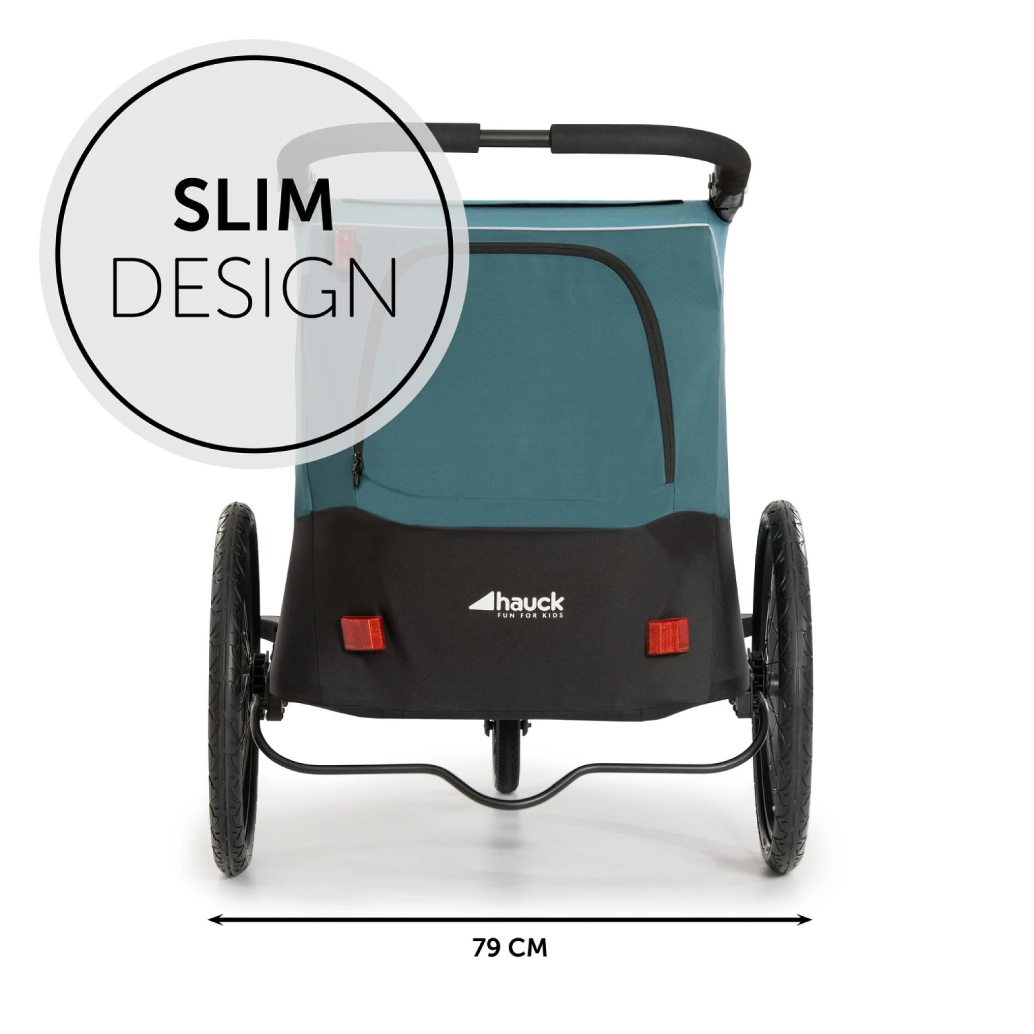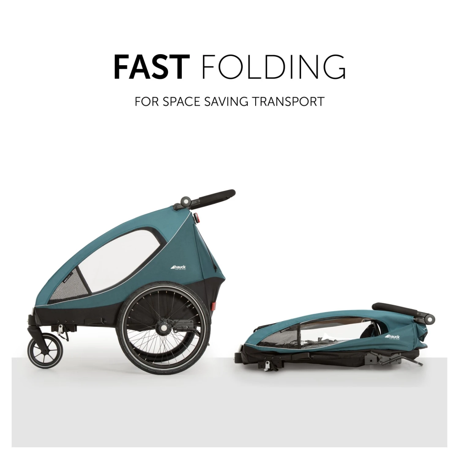 Découvrez le chariot Dryk Duo coloris petrol de la marque Hauck. C’est la remorque idéale pour les promenades avec 1 ou 2 enfants. Vous pourrez le fixer à votre vélo pour vous déplacer en famille ou transformer le chariot en poussette. Le pliage est intuitif et facile.