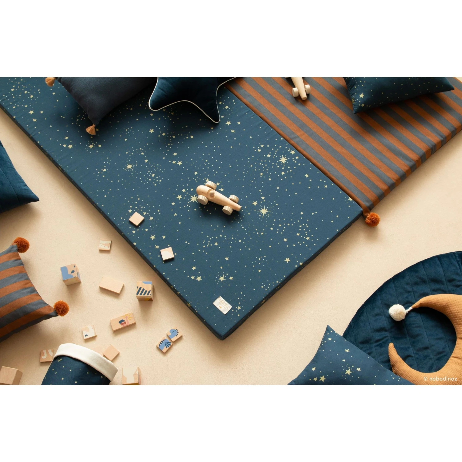 Découvrez le matelas de sol Blue brown stripes de la collection Majestic de la marque Nobodinoz. Avec ses rayures feutrées et ses 4 pompons, il offrira un design singulier pour raviver la chambre de votre enfant ! Pour se reposer ou bien pour jouer, le matelas Majestic sera le cadeau idéal pour un enfant qui aime passer son temps au sol.